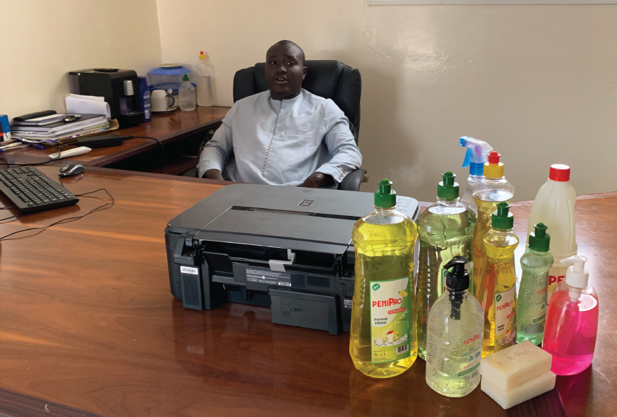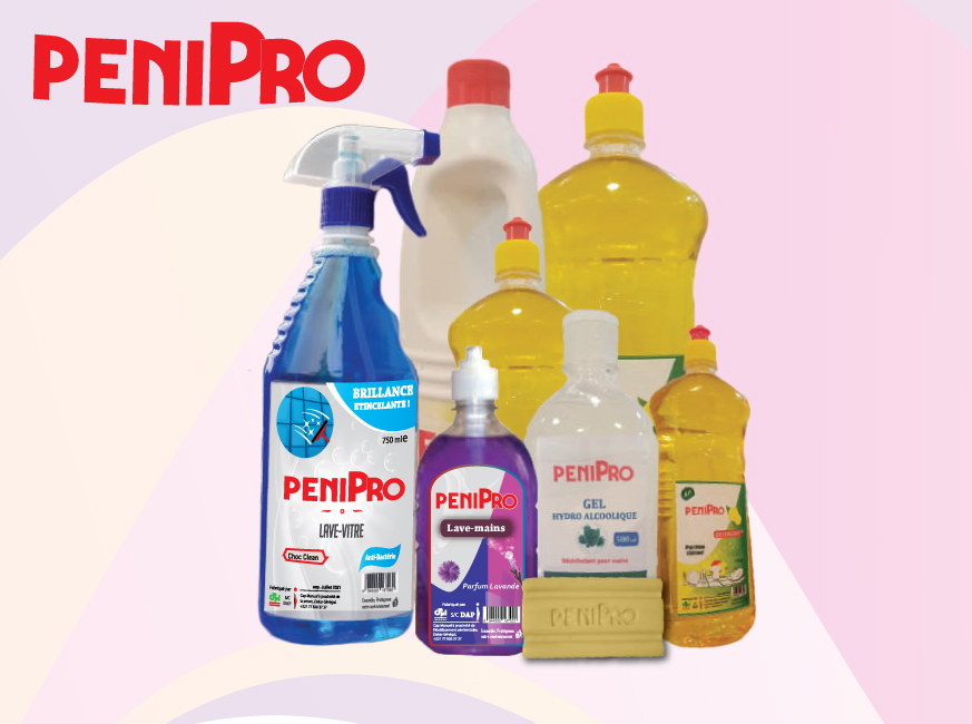 Parmi ces produits, il y a du détergent, du javel liquide, du savon dur, des laves-vitres, de l’hydro-alcoolique, des laves-mains etc. qui y sont faits et traités. La marque de ces Produits est PENIPRO.